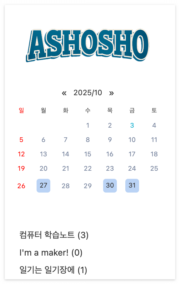 이를 위해 [ HI! / 태그 / © 2025 Ashosho ] 가 모여있는 '메뉴' 라는 위젯의 CSS를 수정해야 합니다.
