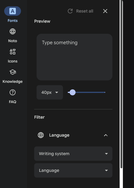 한글폰트를 다운받기 위해 필터에서 한글을 선택하려고 하는데 writing system과 language. 이렇게 두 개의 옵션이 보입니다.